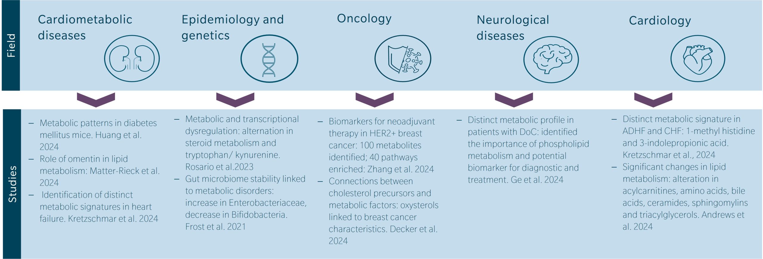 Metabolic profiling is increasingly recognized in cardiology studies. A study by Kretzschmar et al. 2024, analyzed plasma metabolites in patients with acute decompensated heart failure (ADHF) and chronic heart failure (CHF). They found distinct metabolic signatures associated with each phenotype, including potential novel biomarkers for heart failure such as 1-methyl histidine and 3-indolepropionic acid. Another interesting study by Andrews et al. 2024, highlights significant changes in lipid metabolism in mice, specifically focusing on alterations in acylcarnitines, amino acids, bile acids, ceramides, sphingomyelins, and triacylglycerols. These findings pinpoint the mechanisms underlying hepatic steatosis and atherosclerosis development in mice fed the hyperhomocysteinemic diet.