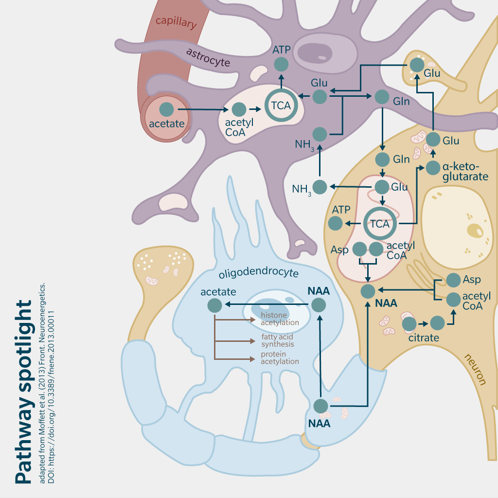NAA is primarily synthesized endogenously. N-acetyl amino acids are synthesized through the breakdown of N-acetyl proteins or direct acetylation of amino acids by specific enzymes (Ramunaidu et al. 2023). In the case of NAA, N-acetylaspartate synthetase (encoded by NAT8L, a gene highly expressed in brain and connective tissue) catalyzes a reaction between acetyl-CoA and aspartic acid to produce NAA in neuronal mitochondria. NAA is transported to oligodendrocytes where it is hydrolyzed by aspartoacylase, producing L-aspartate and acetate (Moffett et al. 2007). Acetate is then incorporated into acetyl-CoA, which is essential for energy production, lipid synthesis and protein acetylation in the brain.