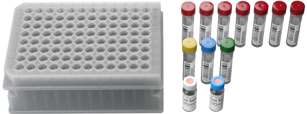 biocrates kits are equipped with all of the required components for a robust, quantitative analysis. For quantification, seven levels of calibration standards and isotope-labeled internal standards are used. For performance validation and data normalization, plasma-based quality control samples at three concentration levels are provided and directly incorporated with our software. All reagents come as lyophilized solids in color-coded vials for quick resuspension and easy preparation.