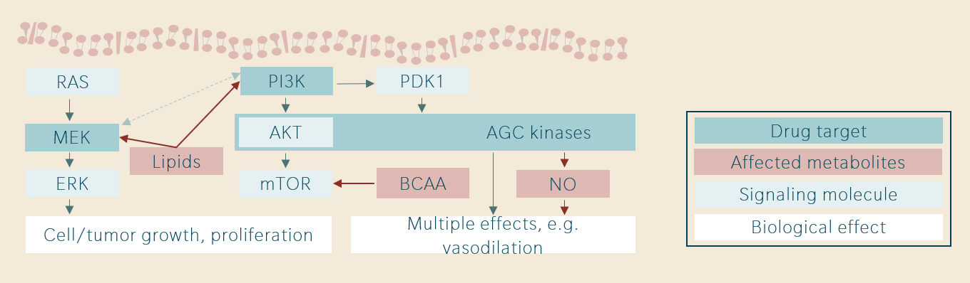 Pal et al. 2020). As a similar experimental approach has been used in several projects, the results shall be discussed together. Figure 2 below shows that MEK inhibitors, PI3K inhibitors and AGC-kinase inhibitors act on interacting pathways. In mouse xenografts, differential dose-dependent metabolic responses have been observed.